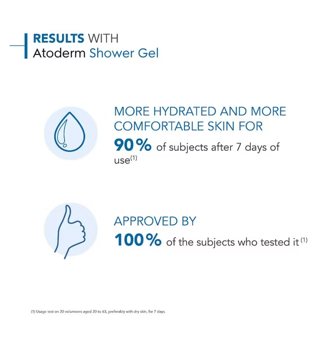 Apply Atoderm Shower gel on damp skin. Lather, then rinse thoroughly. Gently dry skin.