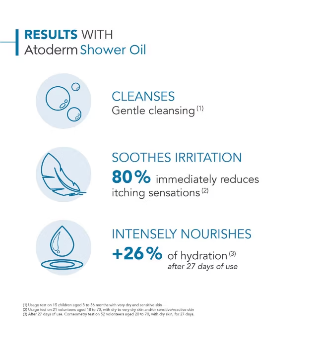 Apply Atoderm Shower oil on damp skin. Lather, then rinse thoroughly. Gently dry the skin.